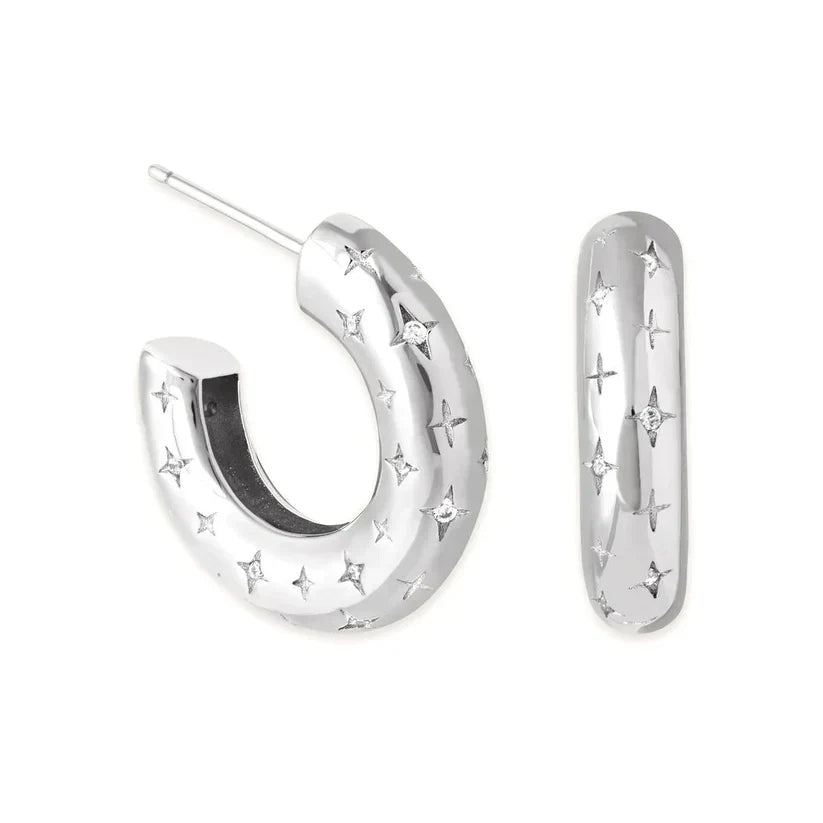Descubre los pendientes Cosmic Hoops, adornados con aros luminosos y delicados detalles en forma de estrella que aportan un suave resplandor celeste. Con un diseño moderno y atemporal, estos pendientes añaden un toque cósmico a tu día a día.